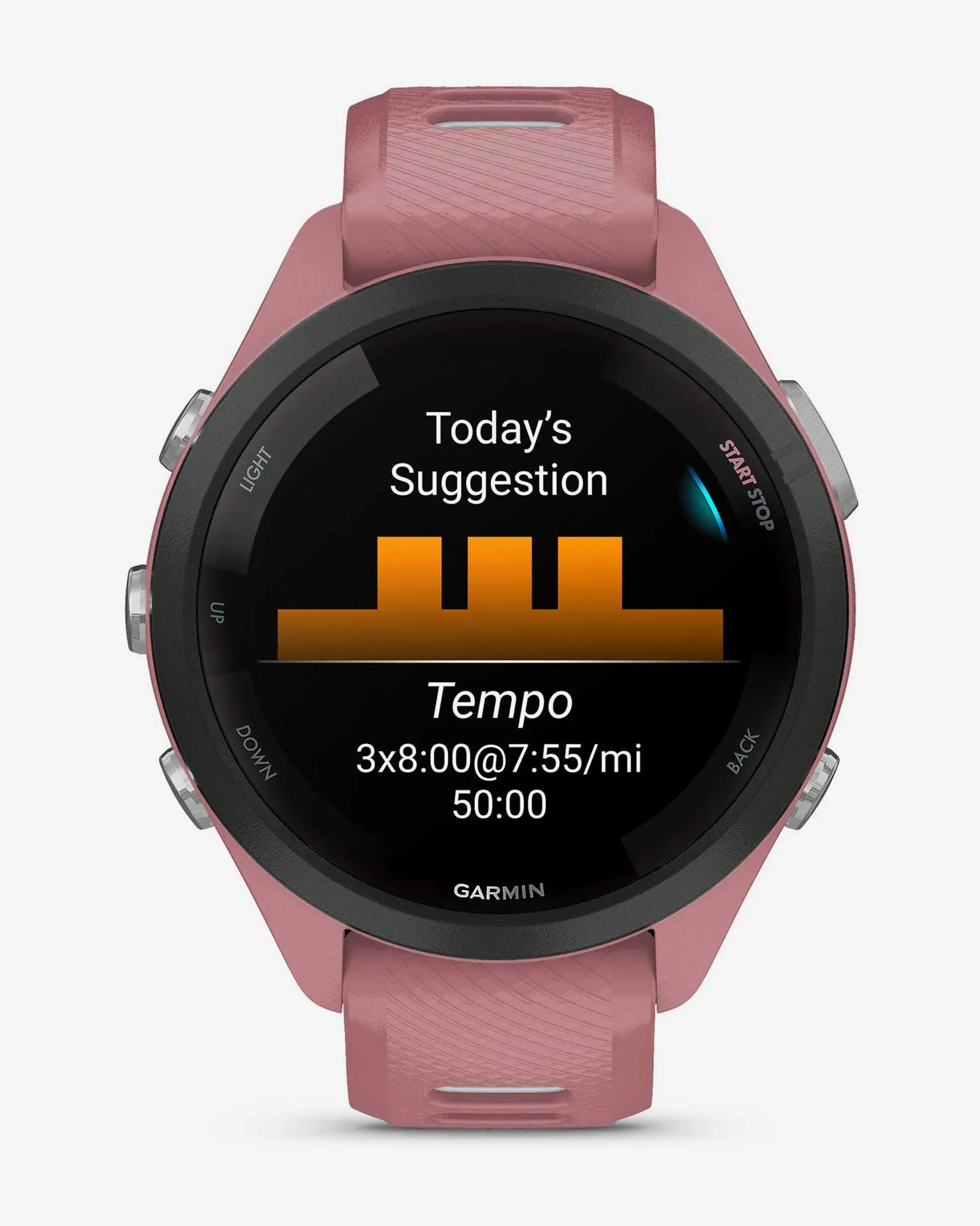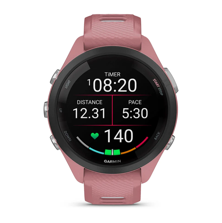 El Garmin Forerunner 265S también incorpora funciones de salud integral como monitorización continua de frecuencia cardíaca, seguimiento del sueño con puntuación, medición de oxígeno en sangre (Pulse Ox) y control del estrés, ayudándote a comprender mejor tu estado físico y bienestar general.